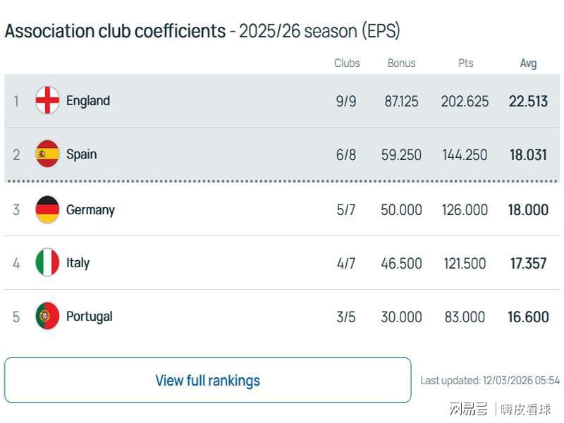 从目前的积分来看,英超虽然优势减少,但是领先幅度还是很大的,主要得益于本赛季增加了新规则。欧洲三大杯的联赛阶段,修改为按照排名来计算奖励积分,而且权重得到大幅提高。